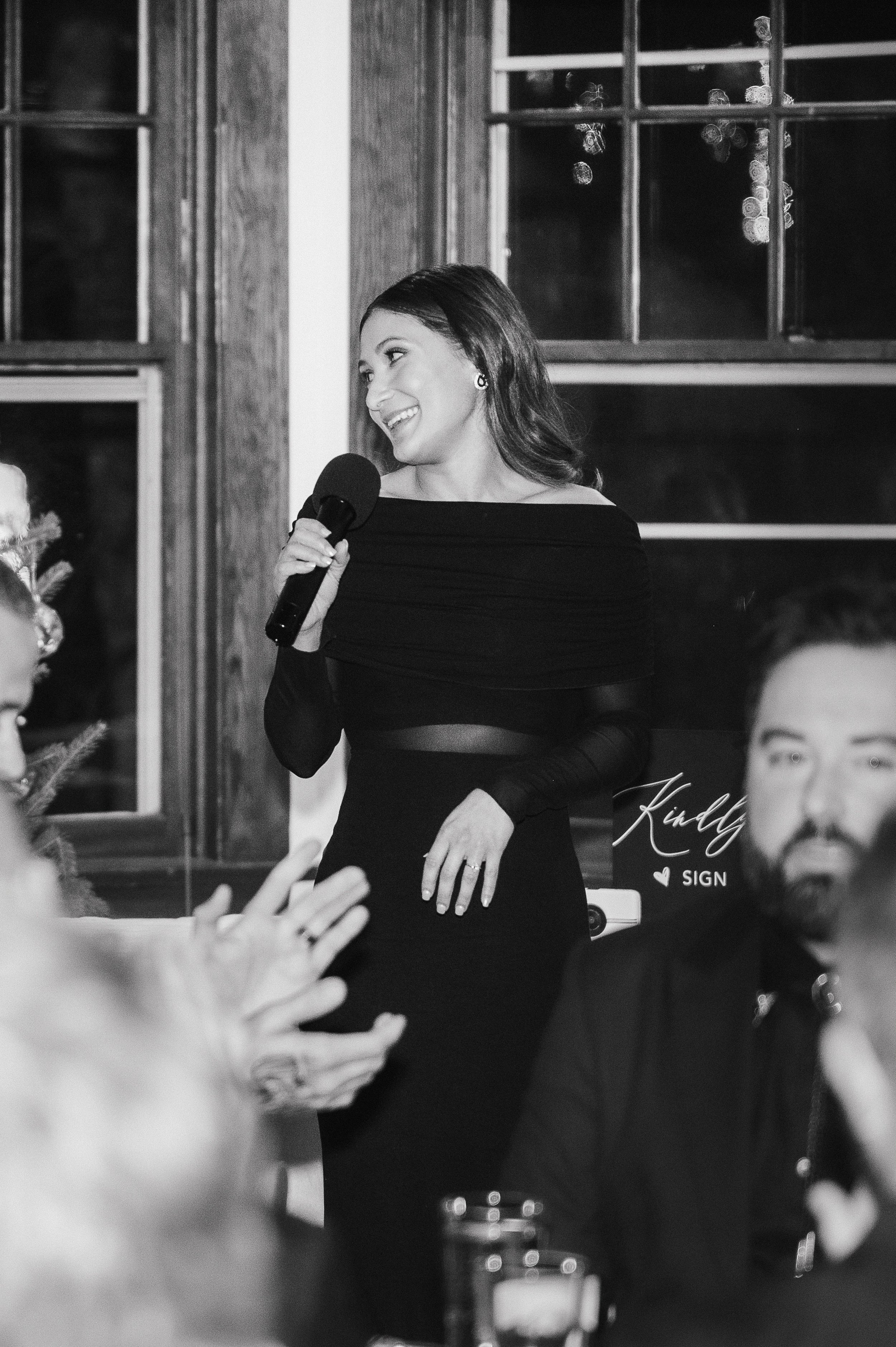 They greeted guests in the downstairs lounge for cocktail hour, where the fireplace was blazing and mistletoe was glittering. Guests arrived dressed to impressβfurs, velvet gloves, and shimmering dresses. Upstairs in the main hall, long family-style tables were set for dinner, fostering a communal and intimate dining ambiance.